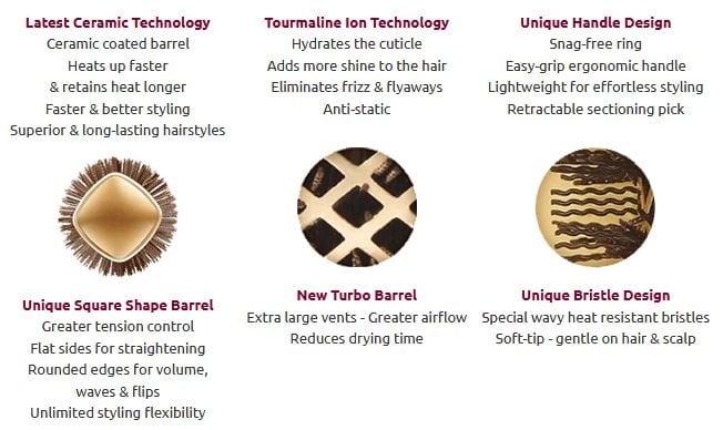 Τελευταίας κεραμικής τεχνολογίας βαρέλι με κεραμική επίστρωση που θερμαίνεται πιο γρήγορα και διατηρεί τη θερμότητα περισσότερο, ενώ οι μεγάλοι αεραγωγοί με καλύτερο στυλ μεγιστοποιούν τη ροή αέρα για όμορφα και μακροχρόνια χτενίσματα. Η τεχνολογία ιόντων τουρμαλίνης ενυδατώνει τις ίνες για περισσότερη λάμψη στα μαλλιά, εξαλείφει το φριζάρισμα και τα ατίθασα μαλλιά με στατικό ηλεκτρισμό. Η τεχνολογία Nano-silver παρέχει αντιβακτηριακή προστασία, τα μαλλιά είναι πιο υγιή και ευκολότερα στο styling.